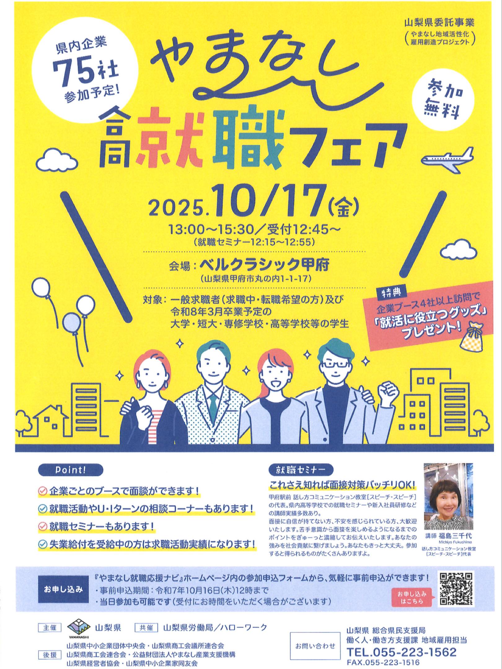 ◆お申し込み 「やまなし就職応援ナビ」ホームページ内の参加申込フォームから事前申込ができます!当日参加も可能です!(受付にお時間をいただく場合がございます)